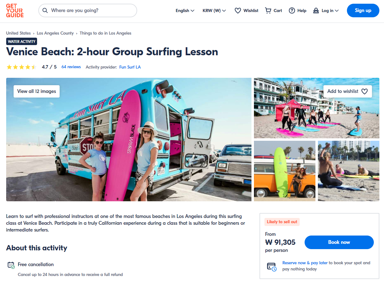 로스앤젤레스에서 가장 유명한 해변중 한곳인 베니스 비치 서핑강습 코스는 GET YOUR GUIDE 사이트에서 예약하실 수 있습니다. 사이트는 특히 전세계 대부분의 나라, 지역의 투어, 교통편 있어, 쉽게 찾을 수 없는 여행지의 다양한 투어 및 서비스를 이용할 수 있는 글로벌 사이트로 한국어사이트는 지원하지 않습니다. (글로벌 한국어 여행사이트를 찾으신다면 klook 여행사이트 추천합니다. 함께 사용하시면 더욱 편하게 여행하실 수 있습니다. klook에 찾는 정보가 없다면 GET YOUR GUIDE에서 찾으시면 됩니다.)