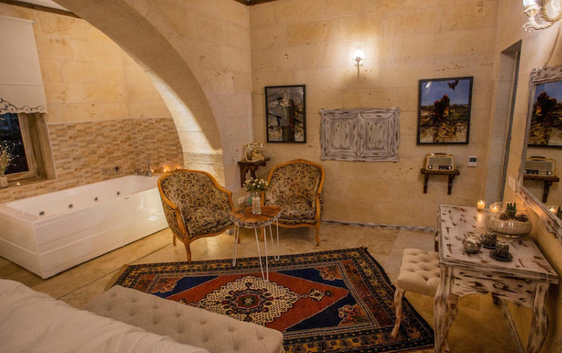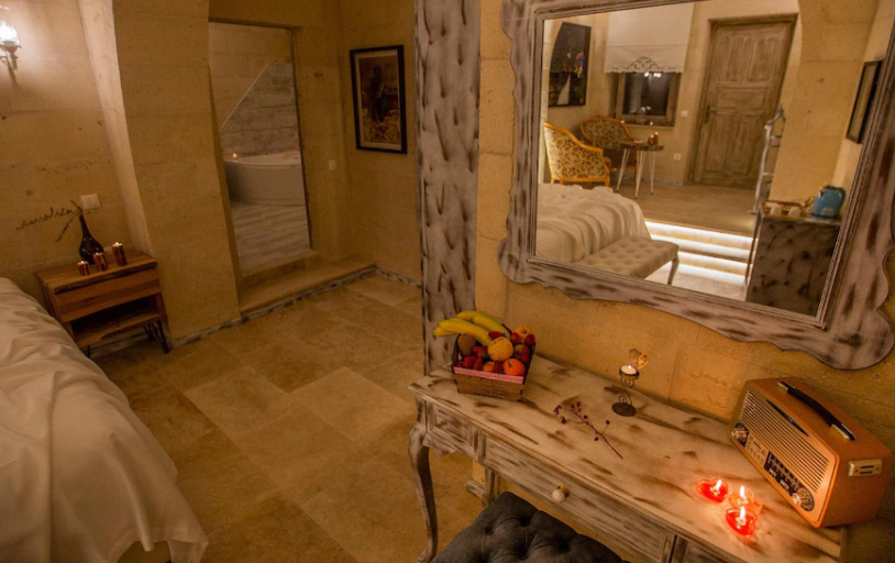 우치히사르호텔 칼리크 케이브 스위트(Karlik Cave Suite)는 독특한 매력을 지닌 숙소입니다. 이 스위트는 과거 동굴 주거지로 사용되었던 공간을 개조하여 만들어졌습니다. 돌과 석회암으로 이루어진 천장과 벽면은 독특한 분위기를 연출하며, 자연스럽게 형성된 굴곡이 마치 예술작품을 감상하는 듯한 느낌을 줍니다.