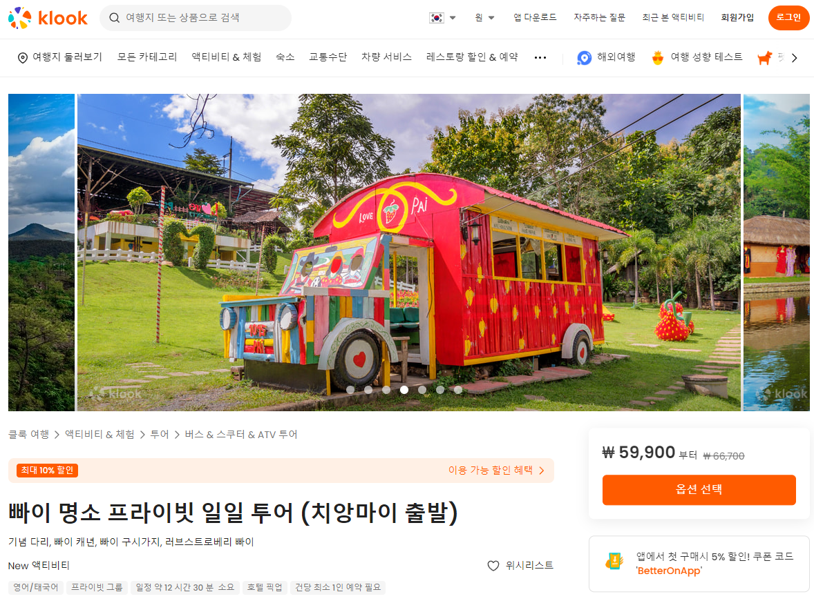 치앙마이출발 빠이 일일투어 일정는 클룩사이트에서 쉽게 예약하실 수 있으며, 현재 할인된 금액에 이용하실 수 있습니다.
