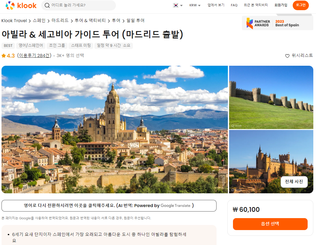 마드리드 출발 아빌라 & 세고비아 가이드 투어는 클룩사이트에서 쉽게 예약하실 수 있으며, 이메일, 전화번호, 카카오톡, 네이버, 구글, 애플, 페이스복 등으로 간편하게 회원가입하고 이용하실 수 있습니다. 가격은 변동될 수 있으므로 예약시 다시 확인하고 이용하세요~