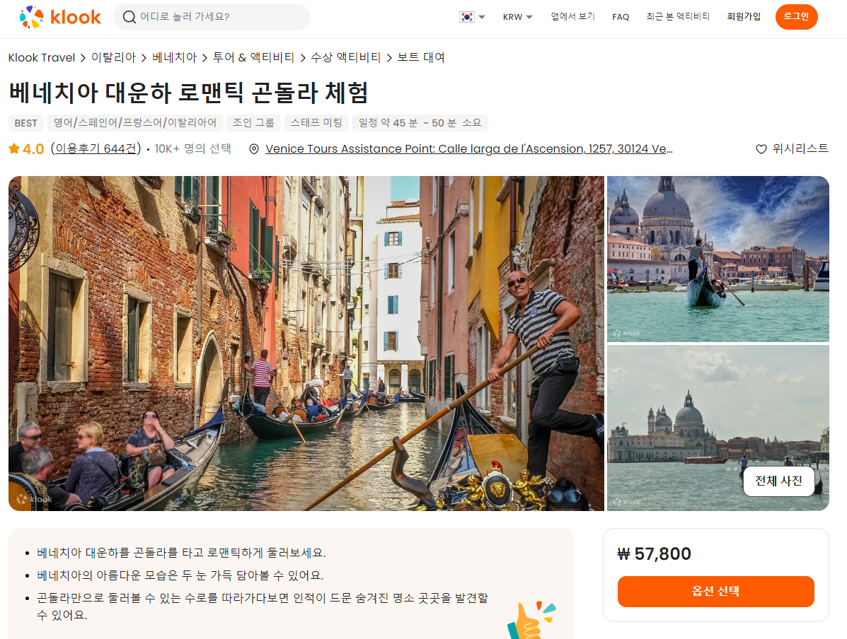 베네치아 곤돌라 탑승 할인 예약은 클룩사이트에서 쉽게 예약하실 수 있으며, 이메일, 전화번호, 카카오톡, 네이버, 구글, 애플, 페이스복 등으로 간편하게 회원가입하고 이용하실 수 있습니다. 가격은 변동될 수 있으므로 예약시 다시 확인하고 이용하세요~