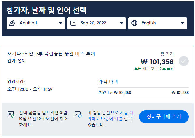 오키나와 얀바루 국립공원 종일 버스 투어는 GET YOUR GUIDE 사이트에서 예약하실 수 있습니다. 사이트는 특히 전세계 대부분의 나라, 지역의 투어, 교통편 있어, 쉽게 찾을 수 없는 여행지의 다양한 투어 및 서비스를 이용할 수 있는 글로벌 사이트로 한국어사이트는 지원하지 않습니다. (글로벌 한국어 여행사이트를 찾으신다면 klook 여행사이트 추천합니다. 함께 사용하시면 더욱 편하게 여행하실 수 있습니다. klook에 찾는 정보가 없다면 GET YOUR GUIDE에서 찾으시면 됩니다.)