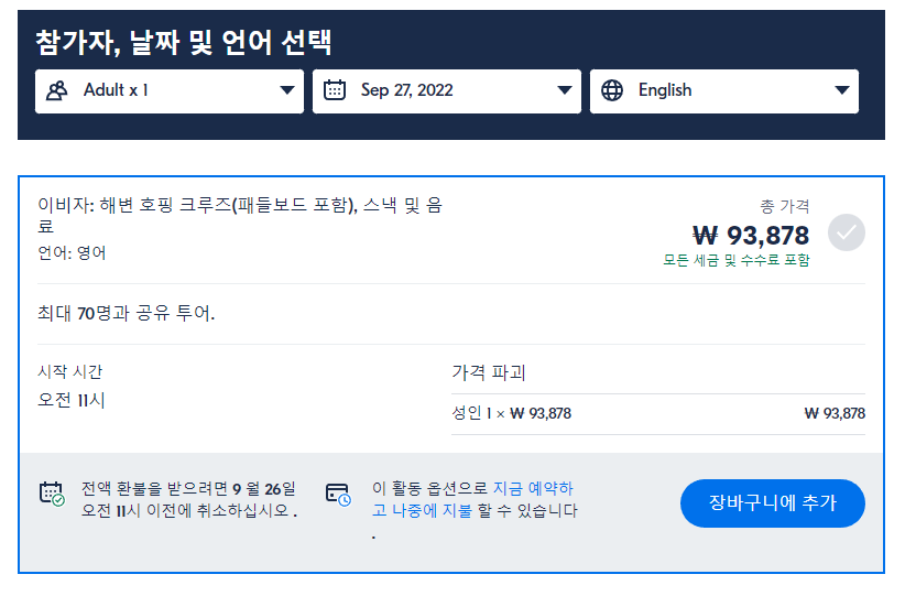 - 활동 기간 동안의 교통편: 스탠드업 패들보드, 관광 크루즈