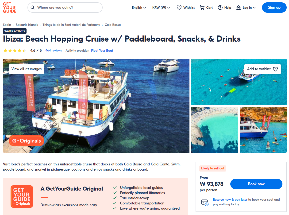 이비자여행코스 호핑 크루즈 투어는 GET YOUR GUIDE 사이트에서 예약하실 수 있습니다. 사이트는 특히 전세계 대부분의 나라, 지역의 투어, 교통편 있어, 쉽게 찾을 수 없는 여행지의 다양한 투어 및 서비스를 이용할 수 있는 글로벌 사이트로 한국어사이트는 지원하지 않습니다. (글로벌 한국어 여행사이트를 찾으신다면 klook 여행사이트 추천합니다. 함께 사용하시면 더욱 편하게 여행하실 수 있습니다. klook에 찾는 정보가 없다면 GET YOUR GUIDE에서 찾으시면 됩니다.)