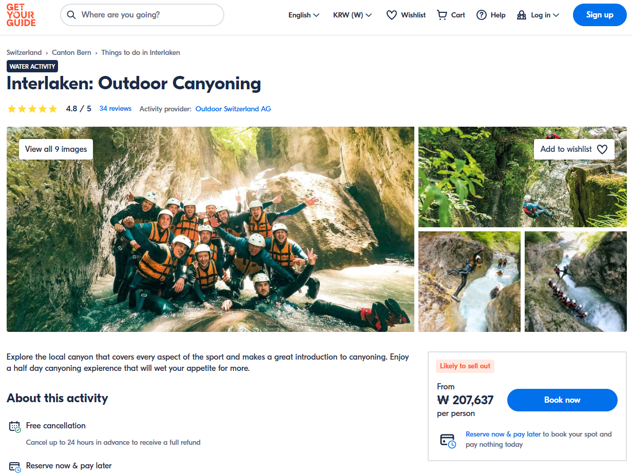 인터라켄 Saxeten 협곡 캐녀닝 투어는 GET YOUR GUIDE 사이트에서 예약하실 수 있습니다. 사이트는 특히 전세계 대부분의 나라, 지역의 투어, 교통편 있어, 쉽게 찾을 수 없는 여행지의 다양한 투어 및 서비스를 이용할 수 있는 글로벌 사이트로 한국어사이트는 지원하지 않습니다. (글로벌 한국어 여행사이트를 찾으신다면 klook 여행사이트 추천합니다. 함께 사용하시면 더욱 편하게 여행하실 수 있습니다. klook에 찾는 정보가 없다면 GET YOUR GUIDE에서 찾으시면 됩니다.)