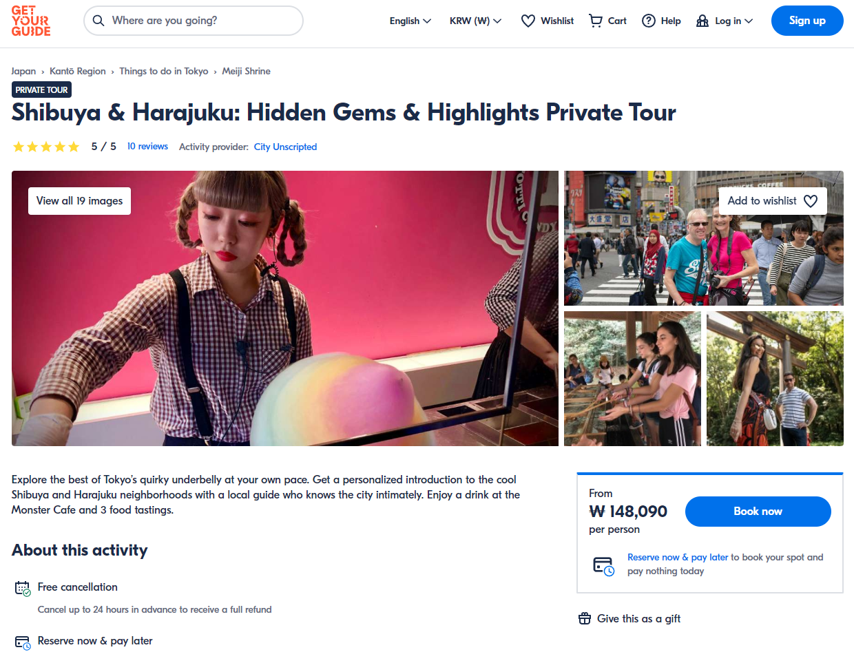 도쿄 시부야와 하라주쿠의 숨겨진 보석 하이라이트 개인투어는 GET YOUR GUIDE 사이트에서 예약하실 수 있습니다. 사이트는 특히 전세계 대부분의 나라, 지역의 투어, 교통편 있어, 쉽게 찾을 수 없는 여행지의 다양한 투어 및 서비스를 이용할 수 있는 글로벌 사이트로 한국어사이트는 지원하지 않습니다. (글로벌 한국어 여행사이트를 찾으신다면 klook 여행사이트 추천합니다. 함께 사용하시면 더욱 편하게 여행하실 수 있습니다. klook에 찾는 정보가 없다면 GET YOUR GUIDE에서 찾으시면 됩니다.)