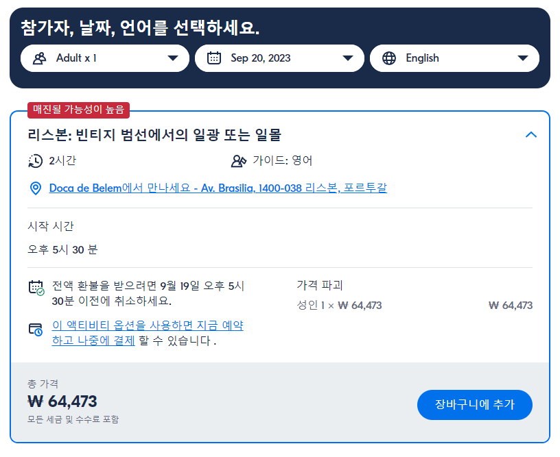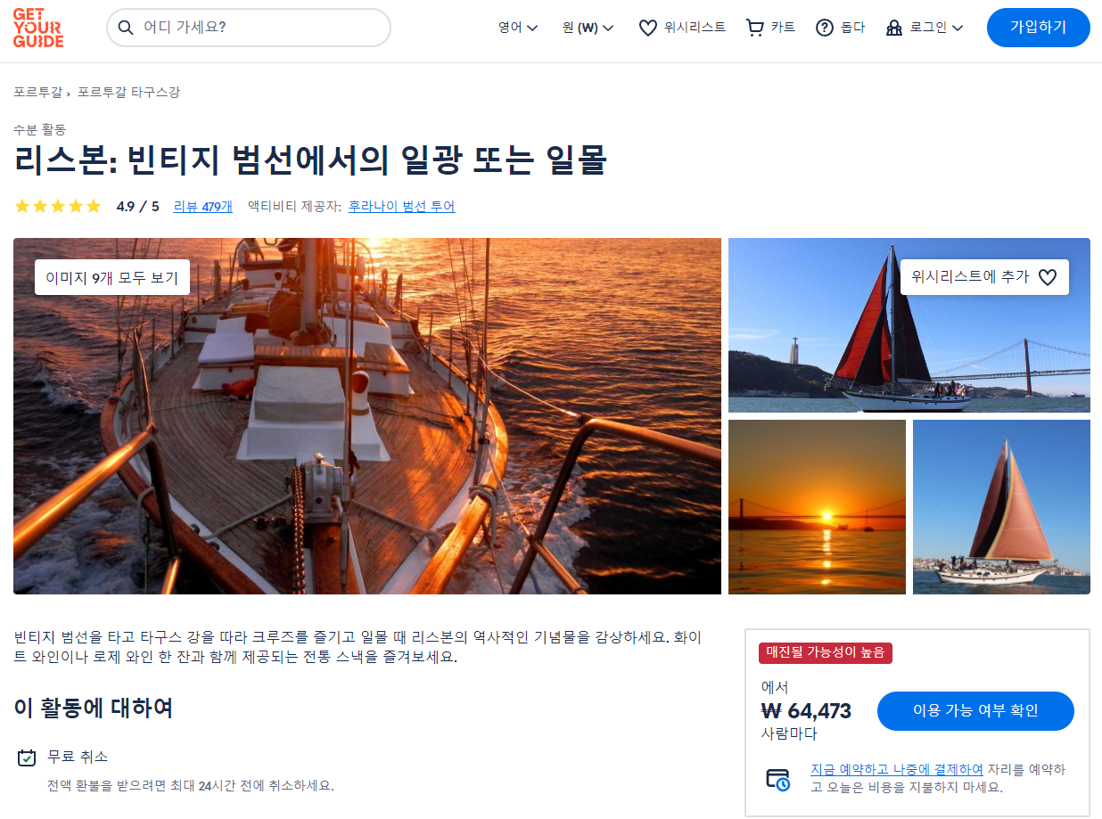 리스본 빈티지 범선에서의 일광 또는 일몰 여행(Lisbon Daylight or Sunset on a Vintage Sailboat)은 GET YOUR GUIDE 사이트에서 예약하실 수 있습니다. 사이트는 특히 전세계 대부분의 나라, 지역의 투어, 교통편 있어, 쉽게 찾을 수 없는 여행지의 다양한 투어 및 서비스를 이용할 수 있는 글로벌 사이트로 한국어사이트는 지원하지 않습니다. (글로벌 한국어 여행사이트를 찾으신다면 klook 여행사이트 추천합니다. 함께 사용하시면 더욱 편하게 여행하실 수 있습니다. klook에 찾는 정보가 없다면 GET YOUR GUIDE에서 찾으시면 됩니다.)