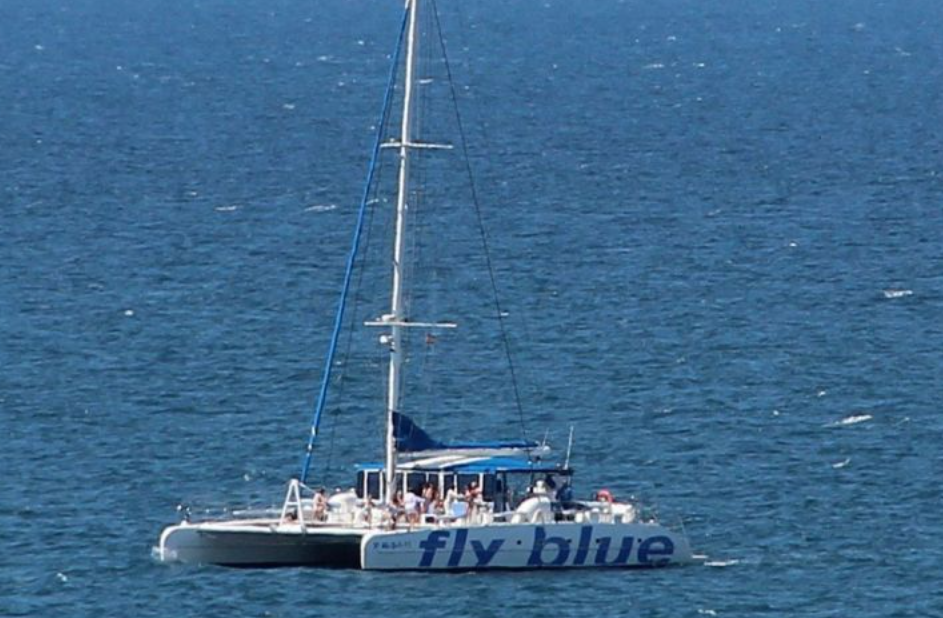 파란색과 흰색으로 쓰여진 Fly Blue라고 적힌 쌍동선을 찾으세요. 귀하의 가이드는 Fly Blue 로고가 있는 파란색 셔츠를 입고 있을 것입니다.