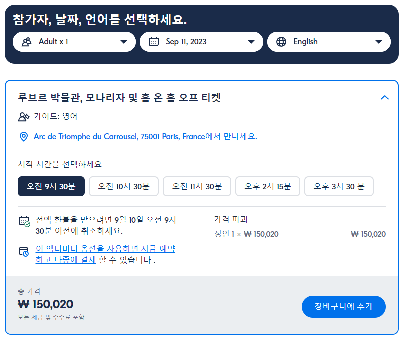 파리 콤보 루브르 우선 입장 및 1일 승하차 투어2층버스(Paris Combo Louvre Skip the Line and Hop on Hop off 1 day)는 GET YOUR GUIDE 사이트에서 예약하실 수 있습니다. 사이트는 특히 전세계 대부분의 나라, 지역의 투어, 교통편 있어, 쉽게 찾을 수 없는 여행지의 다양한 투어 및 서비스를 이용할 수 있는 글로벌 사이트로 한국어사이트는 지원하지 않습니다. (글로벌 한국어 여행사이트를 찾으신다면 klook 여행사이트 추천합니다. 함께 사용하시면 더욱 편하게 여행하실 수 있습니다. klook에 찾는 정보가 없다면 GET YOUR GUIDE에서 찾으시면 됩니다.)