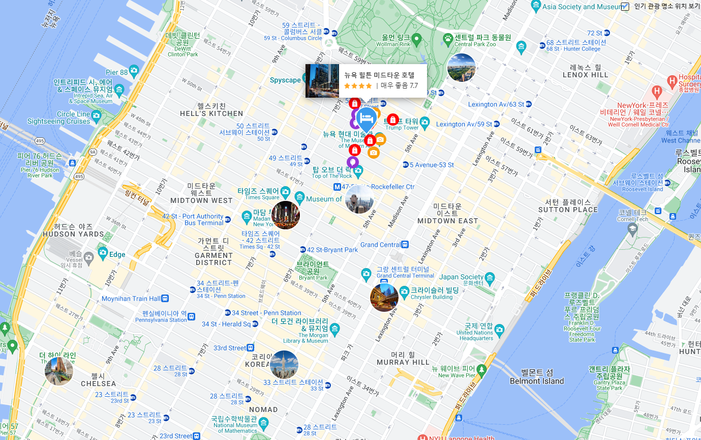 엄청난 땅값을 자랑하는 뉴욕 맨허튼이라는 것을 감안하면 최고의 로케이션에 나쁘지 않은 가격에 나쁘지 않은 룸 컨디션에 묵을 수 있는 호텔이라고 하겠다. 방 사이즈도 어린이 동반 세식구가 묵기에 나쁘지 않다. 많은 관광지가 걸어서 이동할수 있는 위치고 MoMA는 심지어 바로 코앞이다 호텔 바로 앞에 할랄가이즈가 있고 바로 길건너 델리도 있고 스타벅스는 널려 있어 간단한 요기나 간식등을 해결하기도 좋다.