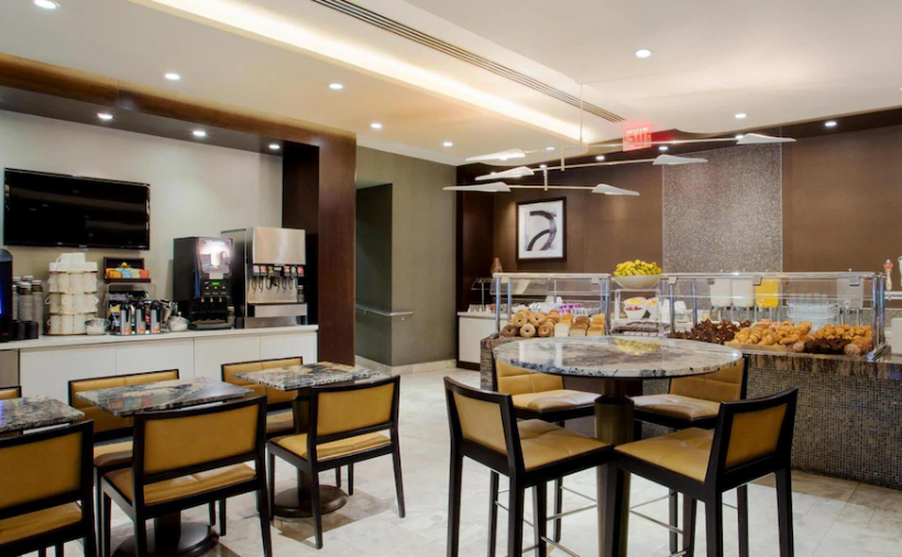 뉴욕의 호텔이 비싼 것은 알고있었지만 실물을 보니, 조금 실망할 수 밖에 없네요. 아주 좁진 않지만, 다른 힐튼호텔과 비교해보면 좀.. 작다고 느껴지네요. 위치는 타임스퀘어까지 도보로 15-20분 거리인데, 완만한 경사가 있어서 산책삼아 왔가닸다하기 좋습니다. 물은 입실 첫 날 2병까지 이고, 저희도 이후에는 근처 편의점에서 사먹었습니다. 도보 5분 정도 거리에 편의점이 하나있습니다. 더 가까이에 있는진 모르겠지만, 제가 찾아본 중엔 없었네요. 조식은 American breakfast 딱 생각하시면 될 것 같아요. 뷔페이지만 채소종류는 없고, 쥬스, 우유, 과일 약간, 빵, 오믈렛 뭐.. 이런 느낌으로 있습니다. 메뉴도 다양하지 않고... 그냥..먹을만 했습니다. 문제는 첫 날 입실 할 때 였습니다. 방문 배터리가 나가 문이 열리지 않았습니다. 처음에 문이 열리지 않아, 키를 잘못 받았나 해서 바꾸어보았지만, 여전히 되지않더군요. 옆에 청소하시던 하우스키핑 분께서 본인 마스터키로 시도해보셨지만 여전히 문이 열리지 않았습니다. 그러자 아마 방 배터리가 나간 것 같다며 security 와 front desk 에 연락해주셨습니다. 30분 가까이 기다렸지만 아무도 오지 않아 재차 전화로 요청을 했으며, 대략 한시간 가까이 기다린 후에야 방으로 들어갈 수 있었습니다. 하지만 호텔에서 어떤 upgrade 나 사과를 받지 못했습니다.