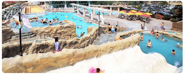 동굴탕 및 연인탕으로 구성된 수공간으로써 물놀이의 재미와 숲속자연의 경치를 느낄수 있는