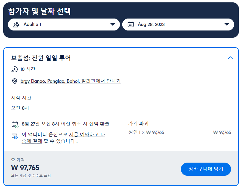 보홀섬 알찬 일일 투어 (Bohol Island Countryside Day Tour)는 GET YOUR GUIDE 사이트에서 예약하실 수 있습니다. 사이트는 특히 전세계 대부분의 나라, 지역의 투어, 교통편 있어, 쉽게 찾을 수 없는 여행지의 다양한 투어 및 서비스를 이용할 수 있는 글로벌 사이트로 한국어사이트는 지원하지 않습니다. (글로벌 한국어 여행사이트를 찾으신다면 klook 여행사이트 추천합니다. 함께 사용하시면 더욱 편하게 여행하실 수 있습니다. klook에 찾는 정보가 없다면 GET YOUR GUIDE에서 찾으시면 됩니다.)