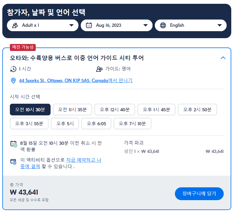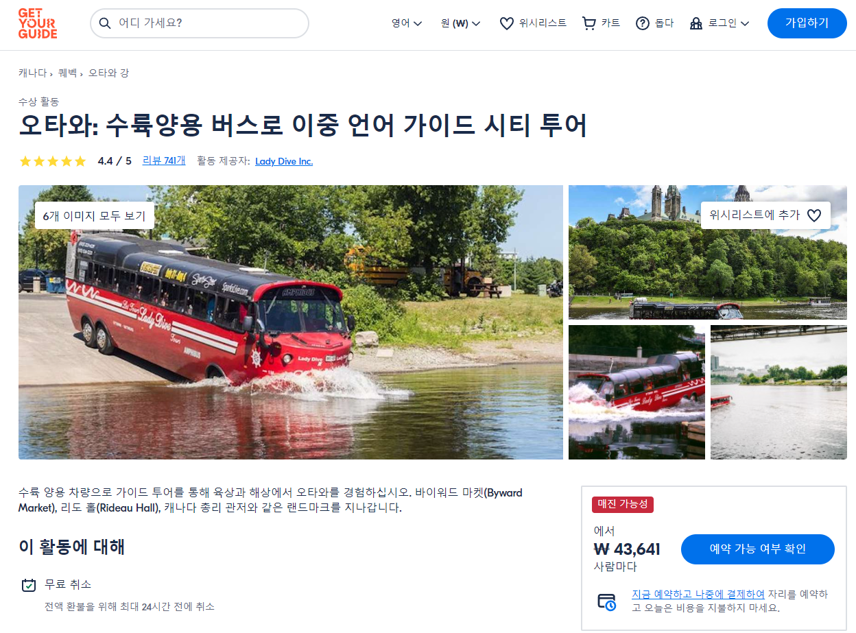 오타와 수륙양용 버스로 가이드 시티 투어 (Ottawa Bilingual Guided City Tour by Amphibious Bus)는 GET YOUR GUIDE 사이트에서 예약하실 수 있습니다. 사이트는 특히 전세계 대부분의 나라, 지역의 투어, 교통편 있어, 쉽게 찾을 수 없는 여행지의 다양한 투어 및 서비스를 이용할 수 있는 글로벌 사이트로 한국어사이트는 지원하지 않습니다. (글로벌 한국어 여행사이트를 찾으신다면 klook 여행사이트 추천합니다. 함께 사용하시면 더욱 편하게 여행하실 수 있습니다. klook에 찾는 정보가 없다면 GET YOUR GUIDE에서 찾으시면 됩니다.)