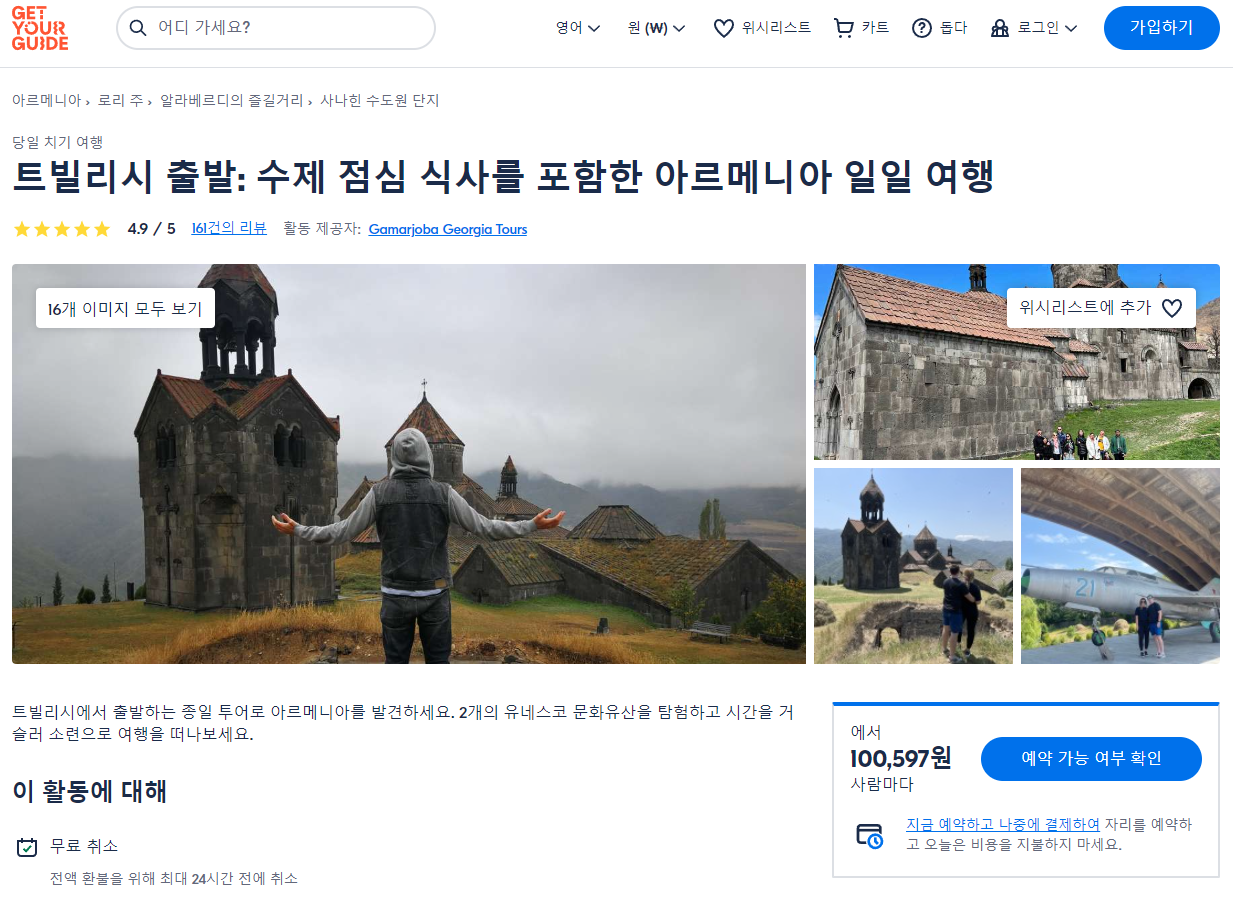 트빌리시출발 수제 점심 식사를 포함한 아르메니아 일일 여행(Day Trip to Armenia Including Homemade Lunch From Tbilisi)은 GET YOUR GUIDE 사이트에서 예약하실 수 있습니다. 사이트는 특히 전세계 대부분의 나라, 지역의 투어, 교통편 있어, 쉽게 찾을 수 없는 여행지의 다양한 투어 및 서비스를 이용할 수 있는 글로벌 사이트로 한국어사이트는 지원하지 않습니다. (글로벌 한국어 여행사이트를 찾으신다면 klook 여행사이트 추천합니다. 함께 사용하시면 더욱 편하게 여행하실 수 있습니다. klook에 찾는 정보가 없다면 GET YOUR GUIDE에서 찾으시면 됩니다.)
