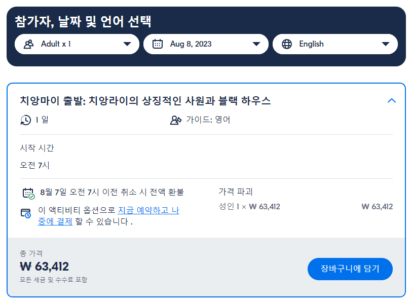 치앙마이 출발 치앙라이의 상징적인 사원과 블랙 하우스(Chiang Rai’s Iconic Temples and Black House From Chiang Mai) 현지투어는 GET YOUR GUIDE 사이트에서 예약하실 수 있습니다. 사이트는 특히 전세계 대부분의 나라, 지역의 투어, 교통편 있어, 쉽게 찾을 수 없는 여행지의 다양한 투어 및 서비스를 이용할 수 있는 글로벌 사이트로 한국어사이트는 지원하지 않습니다. (글로벌 한국어 여행사이트를 찾으신다면 klook 여행사이트 추천합니다. 함께 사용하시면 더욱 편하게 여행하실 수 있습니다. klook에 찾는 정보가 없다면 GET YOUR GUIDE에서 찾으시면 됩니다.)