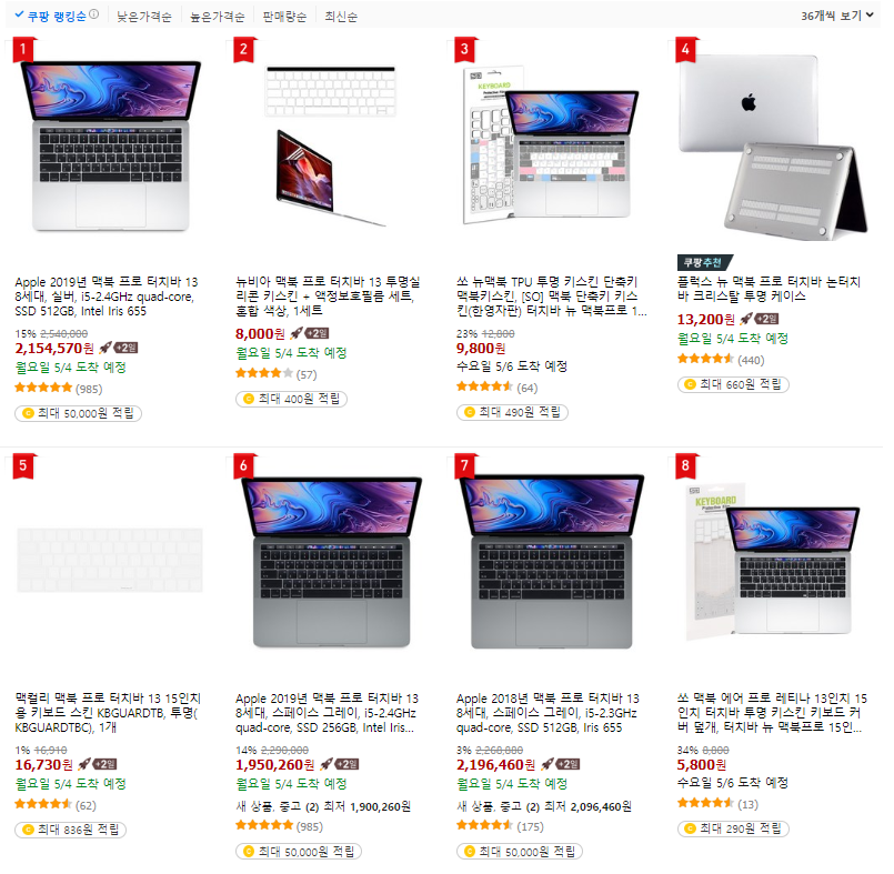 쿠팡사이트에서 맥북 프로 터치바 13 를 검색하시면