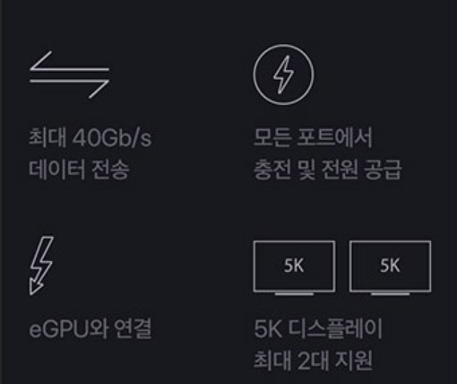 업계 표준인 USB-C의 엄청난 범용성과 초고대역폭의 속도 및 성능, 이 두 장점이 합쳐져 만들어진 Thunderbolt 3는 모든 면에서 한층 업그레이드된 범용 포트라 할 수 있습니다. 커넥터 하나로 데이터 전송, 충전, 동영상 출력이 모두 가능하고, Thunderbolt 2보다 2배 커진 대역폭으로 최대 40Gb/s의 처리량을 자랑하죠. 그리고 두 가지 크기의 MacBook Pro 모델 모두 최대 4개의 포트를 가지고 있어 왼쪽이나 오른쪽, 어느 쪽에서든 편하게 모든 연결이 가능하답니다. 케이블이나 어댑터를 사용해 기존에 쓰던 기기들도 쉽게 연결할 수 있습니다. 게다가 Thunderbolt 3는 리버서블 디자인이란 사실, 바로 꽂아도, 뒤집어서 꽂아도 문제없죠.