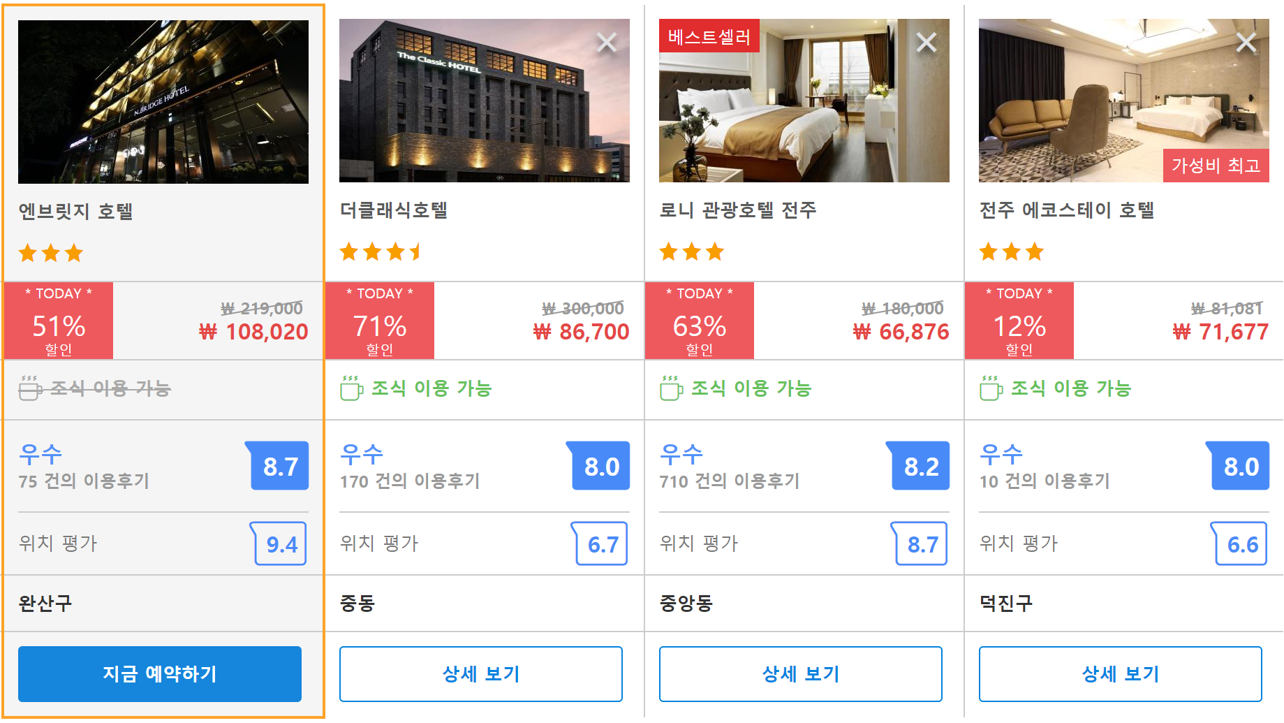 전주 엔브릿지 호텔 (N Bridge Hotel)의 최저 가격대는 아고다에서 할인특가 가격으로 매일매일 변동되며 10만원대부터 다양하게 형성됩니다. 아고다 최저가를 확인하시려면 아래 링크를 누르시면 원하는 날짜의 가격대를 자세히 보실 수 있습니다.