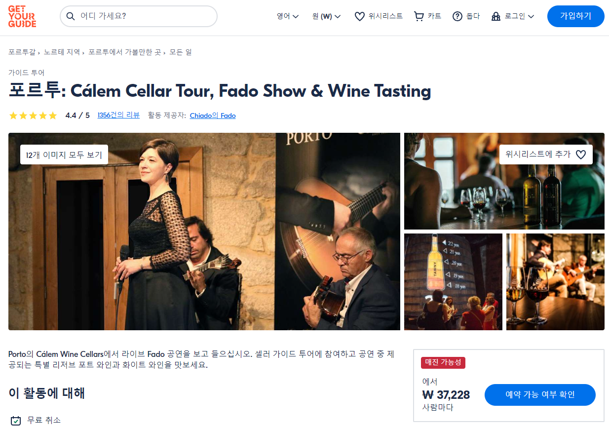 포르투의 와인과 함께 하는 라이브 파도 음악공연(Porto Cálem Cellar Tour, Fado Show & Wine Tasting)은 GET YOUR GUIDE 사이트에서 예약하실 수 있습니다. 사이트는 특히 전세계 대부분의 나라, 지역의 투어, 교통편 있어, 쉽게 찾을 수 없는 여행지의 다양한 투어 및 서비스를 이용할 수 있는 글로벌 사이트로 한국어사이트는 지원하지 않습니다. (글로벌 한국어 여행사이트를 찾으신다면 klook 여행사이트 추천합니다. 함께 사용하시면 더욱 편하게 여행하실 수 있습니다. klook에 찾는 정보가 없다면 GET YOUR GUIDE에서 찾으시면 됩니다.)