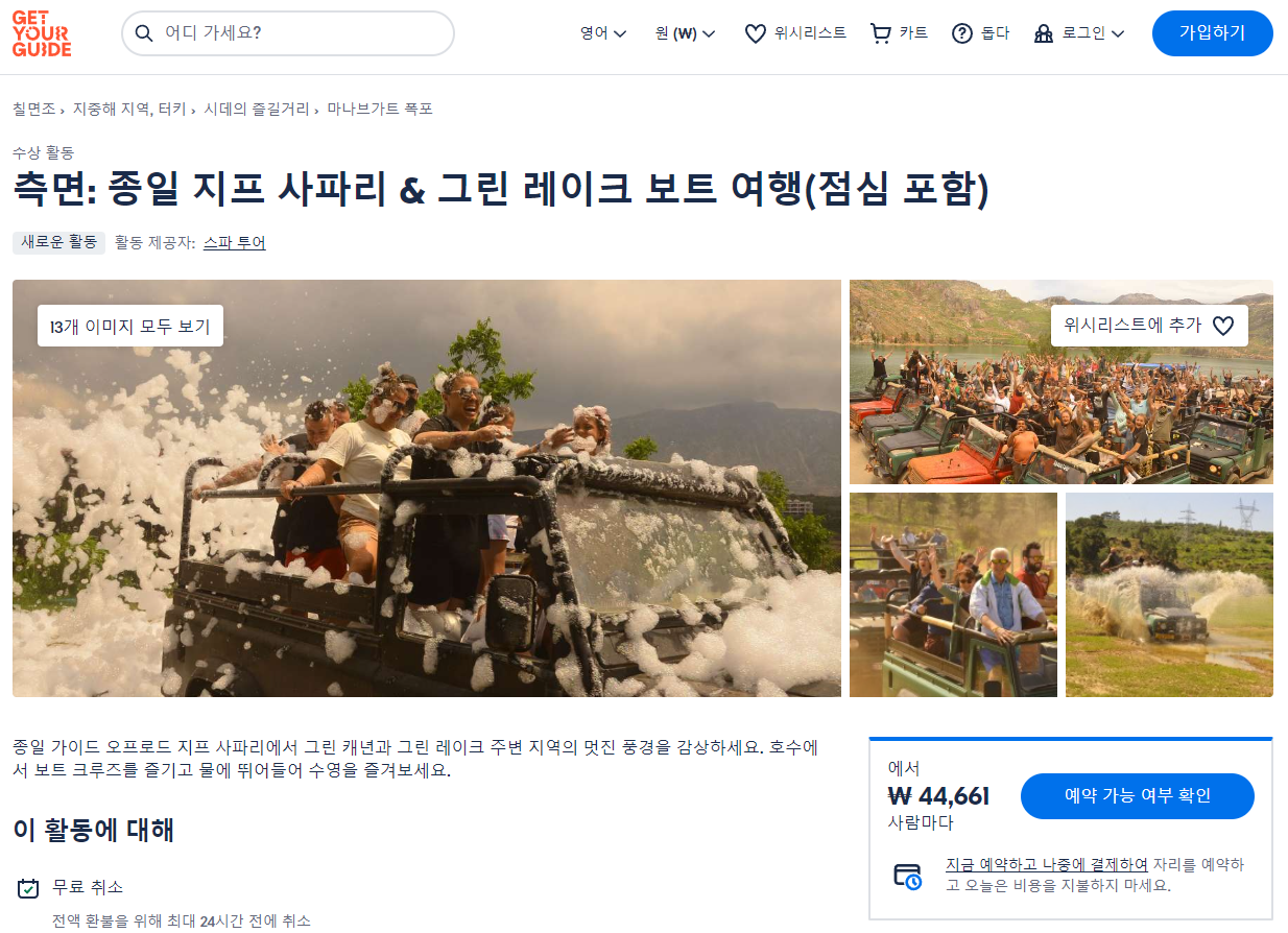 시대 종일 지프 사파리와 그린 레이크 보트 크루즈 점심 포함 현지투어(Side Full-Day Jeep Safari & Green Lake Boat Trip w/ Lunch)는 GET YOUR GUIDE 사이트에서 예약하실 수 있습니다. 사이트는 특히 전세계 대부분의 나라, 지역의 투어, 교통편 있어, 쉽게 찾을 수 없는 여행지의 다양한 투어 및 서비스를 이용할 수 있는 글로벌 사이트로 한국어사이트는 지원하지 않습니다. (글로벌 한국어 여행사이트를 찾으신다면 klook 여행사이트 추천합니다. 함께 사용하시면 더욱 편하게 여행하실 수 있습니다. klook에 찾는 정보가 없다면 GET YOUR GUIDE에서 찾으시면 됩니다.)