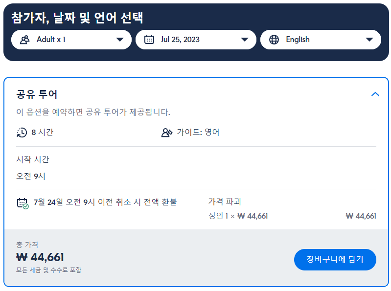 그리고 한국인들이 많이 참여하는 투어보다 다양한 나라의 사람들이 많이 참여하는 만큼 다른사람들 시선을 신경쓰지 않고 편하게 여행을 즐기길 원하는 사람들에게 더욱 추천합니다. 한국어로 쉽게 예약할 수 있고 한국분들이 많이 참여하는 투어는 klook 여행사이트에서 예약하시고 한국분들 많이 참여하지 않는 현지투어의 분위기를 좋아하시는 분들은 GET YOUR GUIDE에 예약하시면 됩니다.