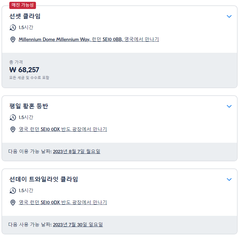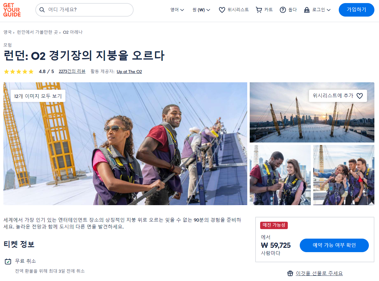 런던 O2 경기장의 지붕을 오르는 투어(London Climb The Roof of The O2 Arena)는 GET YOUR GUIDE 사이트에서 예약하실 수 있습니다. 사이트는 특히 전세계 대부분의 나라, 지역의 투어, 교통편 있어, 쉽게 찾을 수 없는 여행지의 다양한 투어 및 서비스를 이용할 수 있는 글로벌 사이트로 한국어사이트는 지원하지 않습니다. (글로벌 한국어 여행사이트를 찾으신다면 klook 여행사이트 추천합니다. 함께 사용하시면 더욱 편하게 여행하실 수 있습니다. klook에 찾는 정보가 없다면 GET YOUR GUIDE에서 찾으시면 됩니다.)
