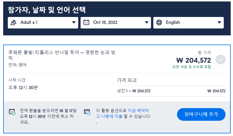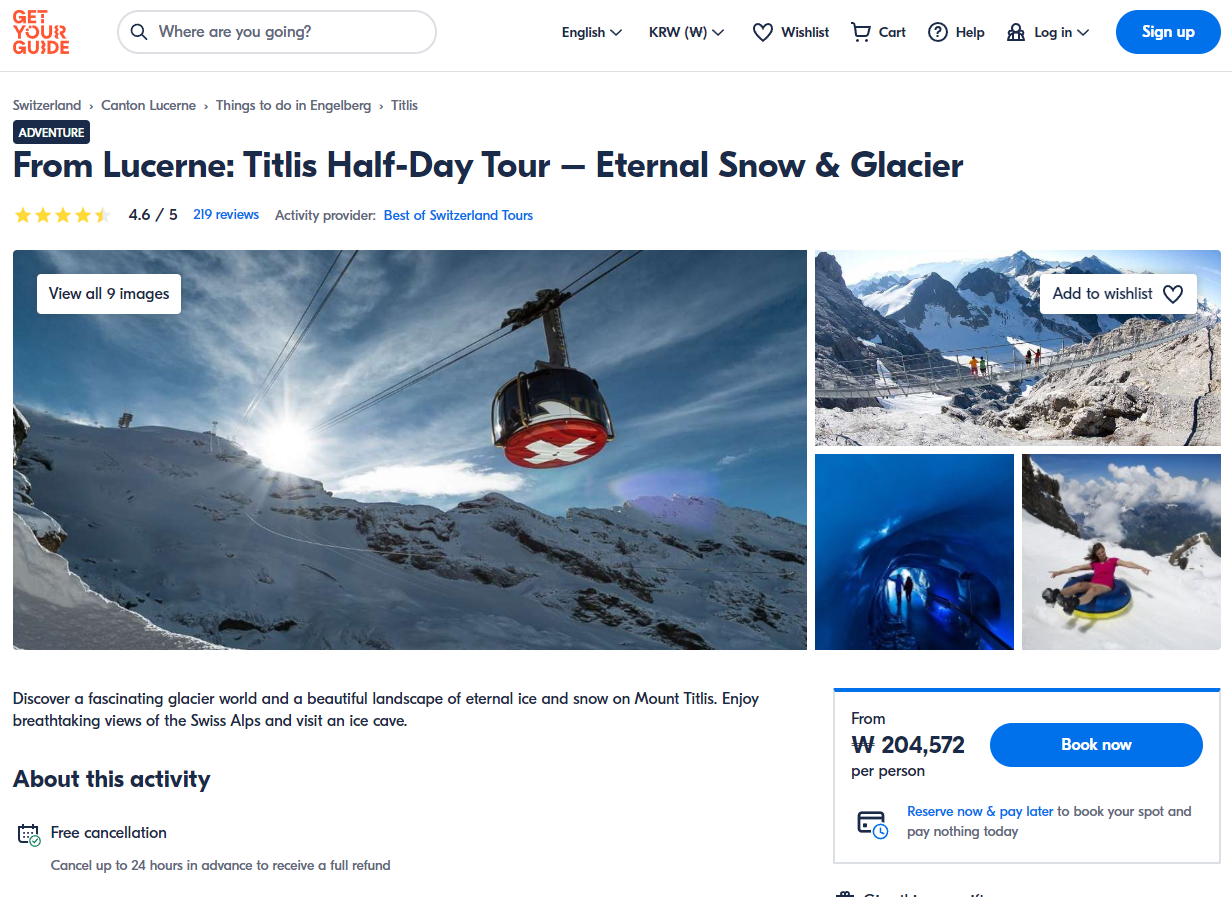 루체른 출발 티틀리스 반나절 투어는 GET YOUR GUIDE 사이트에서 예약하실 수 있습니다. 사이트는 특히 전세계 대부분의 나라, 지역의 투어, 교통편 있어, 쉽게 찾을 수 없는 여행지의 다양한 투어 및 서비스를 이용할 수 있는 글로벌 사이트로 한국어사이트는 지원하지 않습니다. (글로벌 한국어 여행사이트를 찾으신다면 klook 여행사이트 추천합니다. 함께 사용하시면 더욱 편하게 여행하실 수 있습니다. klook에 찾는 정보가 없다면 GET YOUR GUIDE에서 찾으시면 됩니다.)