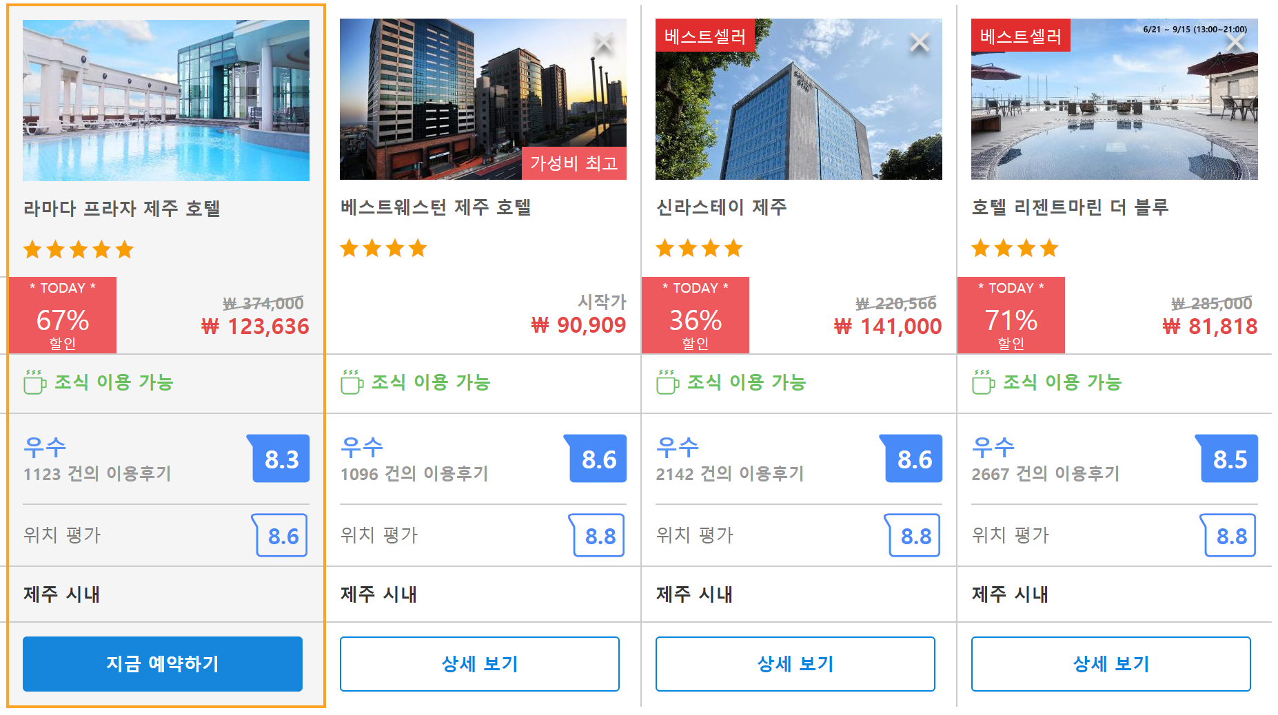 라마다 프라자 제주 호텔 (Ramada Plaza Jeju)라마다 프라자 제주 호텔 (Ramada Plaza Jeju)의 최저 가격대는 아고다에서 할인특가 가격으로 매일매일 변동되며 평균 10만원대부터 다양하게 형성됩니다. 아고다 최저가를 확인하시려면 아래 링크를 누르시면 원하는 날짜의 가격대를 자세히 보실 수 있습니다.