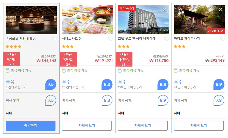 히타료칸 츠에타테 온천 히젠야 (Hizenya)의 최저 가격대는 아고다웹사이트에서 할인특가 가격으로 매일매일 변동되며 30만원대부터 다양하게 형성됩니다. 날짜별로 매일 가격이 다르므로 아고다웹사이트 최저가를 확인하시려면 아래 링크를 누르시고 원하는 날짜의 가격대를 선택해야 정확한 가격을 자세히 보실 수 있습니다.