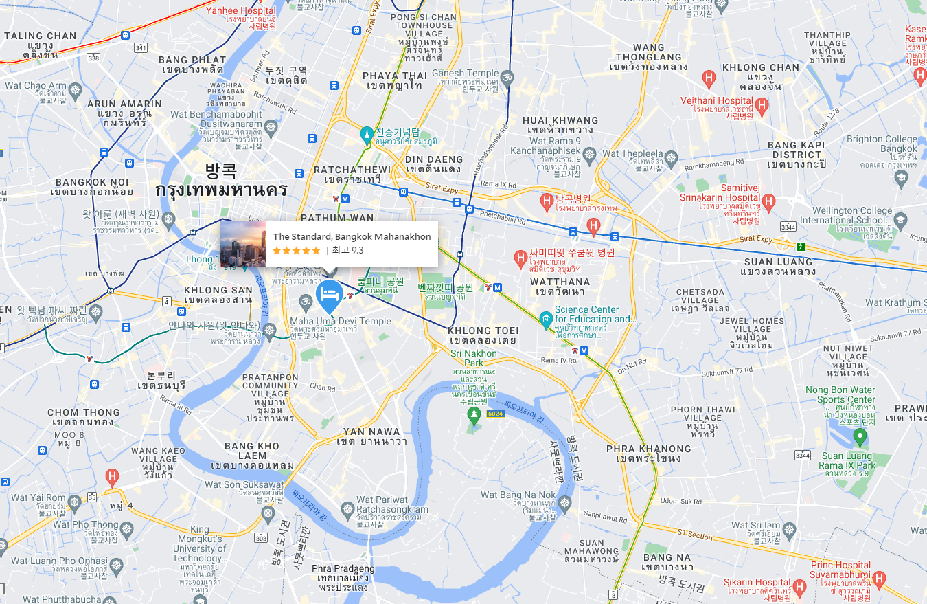 방콕여행에 추천하는 시암과 아시안티크 중간에 위치한 더 스탠다드, 방콕 마하나콘(The Standard, Bangkok Mahanakhon)은 수완나품국제공항, 돈무앙국제공항에서 20 ~25km 거리에 있으며 가까운 역은 BTS 총농시역, BTS 살라댕역이 있습니다. 디자인이 재미있고 상쾌하기 때문에 예술적 감각이 있는 럭셔리 이 호텔을 추천합니다. 그리고 호텔 주변에는 멋진 레스토랑도 많이 있습니다.