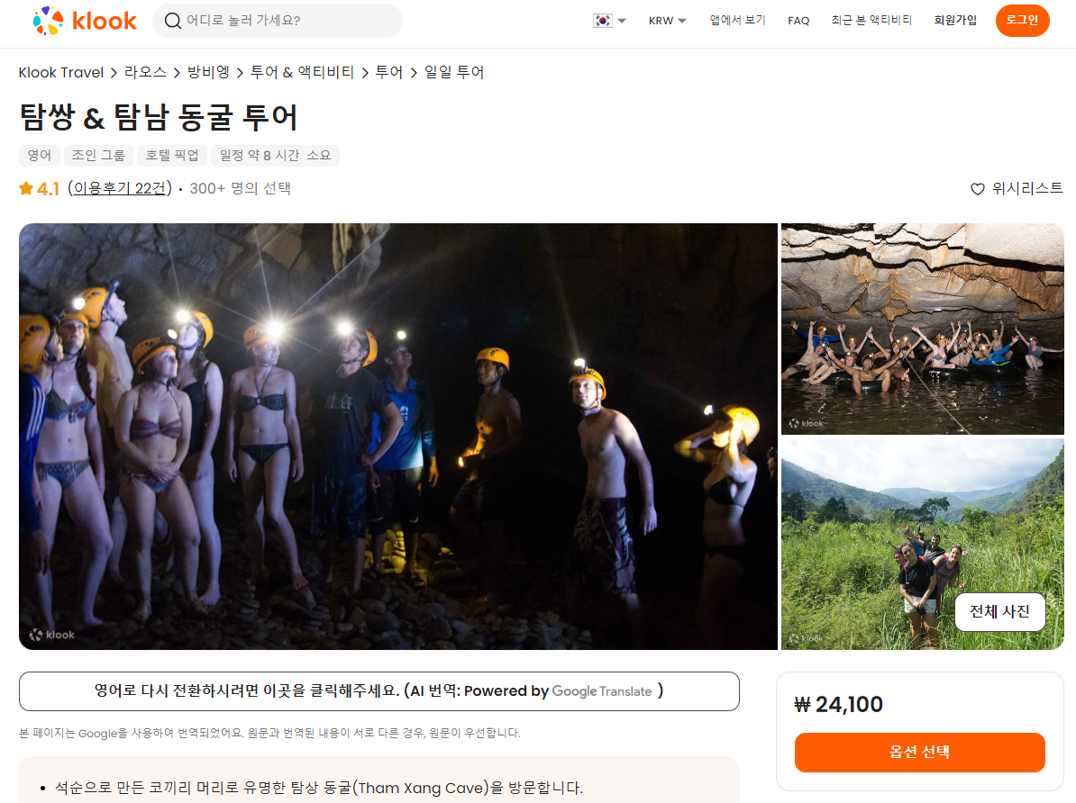 방비엥 탐쌍 & 탐남 동굴 투어는 클룩사이트에서 쉽게 예약하실 수 있으며, 이메일, 전화번호, 카카오톡, 네이버, 구글, 애플, 페이스복 등으로 간편하게 회원가입하고 이용하실 수 있습니다. 가격은 변동될 수 있으므로 예약시 다시 확인하고 이용하세요~
