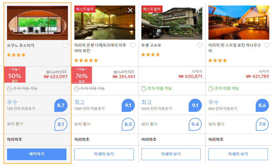 아리마온천마을 오쿠노 호소미치 (Okuno Hosomichi)의 최저 가격대는 아고다웹사이트에서 할인특가 가격으로 매일매일 변동되며 60만원대부터 다양하게 형성됩니다. 날짜별로 매일 가격이 다르므로 아고다웹사이트 최저가를 확인하시려면 아래 링크를 누르시고 원하는 날짜의 가격대를 선택해야 정확한 가격을 자세히 보실 수 있습니다.