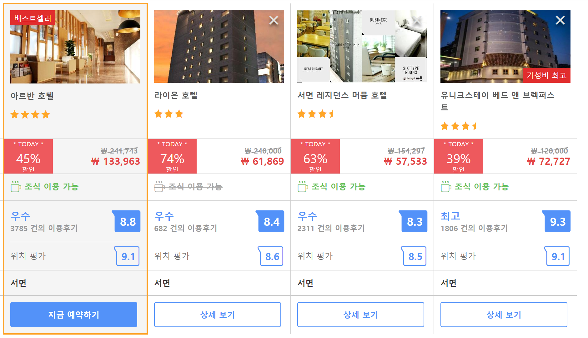 다음날 김해공항으로 가기위해 잠시 묵었던곳입니다. 1.위치 : 서면시장과 매우 근접합니다. 호텔 바로 앞에 편의점및 편의시설 많이 있어요, 근처에 롯데백화점있어요. 2.룸 컨디션: 룸컨디션 좋았어요. 불편함 없이 잘 지냈습니다. 3.조식:조식은...음... 어... 무난한 느낌이었어요. 4.직원태도: 리셉션및 조식당직원 친절합니다. 5.가격대비 만족합니다.