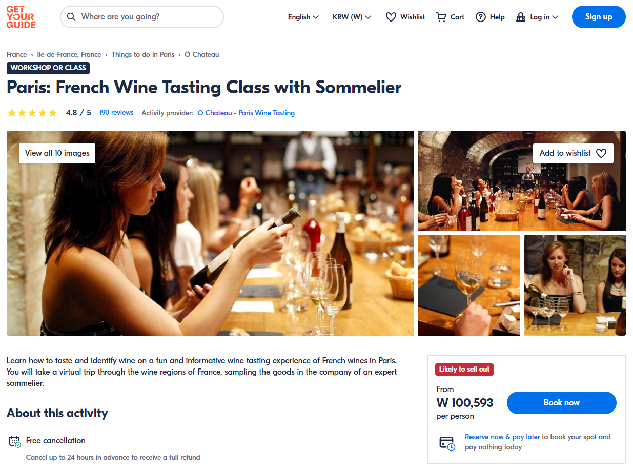 파리여행에 소믈리에와 함께하는 프랑스 와인 시음 교실은 GET YOUR GUIDE 사이트에서 예약하실 수 있습니다. 사이트는 특히 전세계 대부분의 나라, 지역의 투어, 교통편 있어, 쉽게 찾을 수 없는 여행지의 다양한 투어 및 서비스를 이용할 수 있는 글로벌 사이트로 한국어사이트는 지원하지 않습니다. (글로벌 한국어 여행사이트를 찾으신다면 klook 여행사이트 추천합니다. 함께 사용하시면 더욱 편하게 여행하실 수 있습니다. klook에 찾는 정보가 없다면 GET YOUR GUIDE에서 찾으시면 됩니다.)