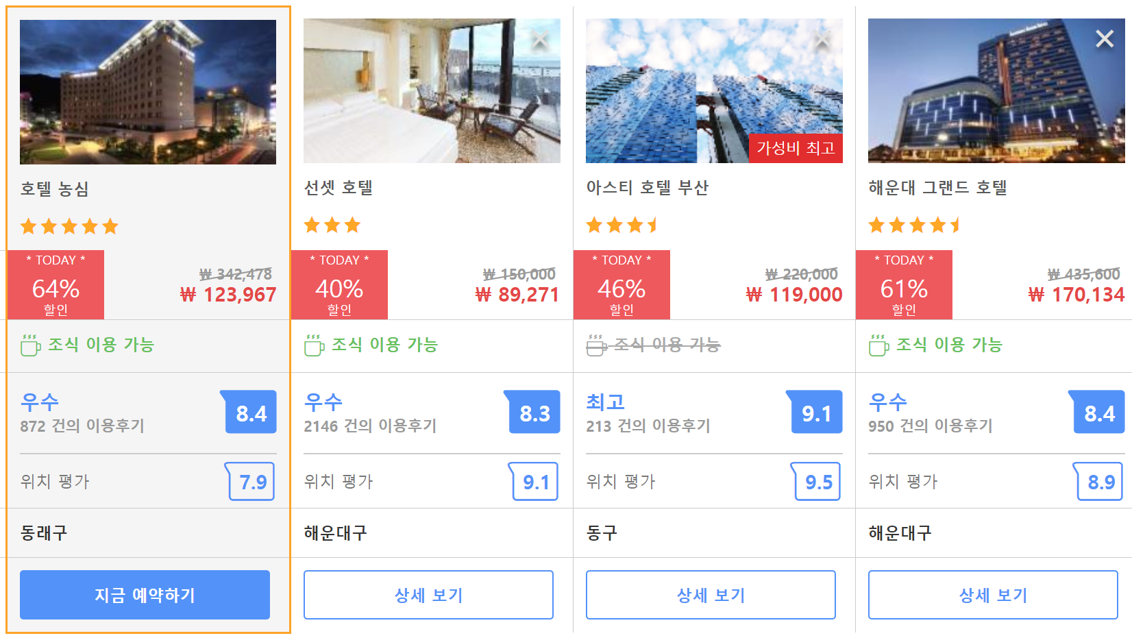 부산호텔 농심 (Hotel Nongshim)의 최저 가격대는 아고다에서 할인특가 가격으로 매일매일 변동되며 평균 10만원대부터 다양하게 형성됩니다. 아고다 최저가를 확인하시려면 아래 링크를 누르시면 원하는 날짜의 가격대를 자세히 보실 수 있습니다.