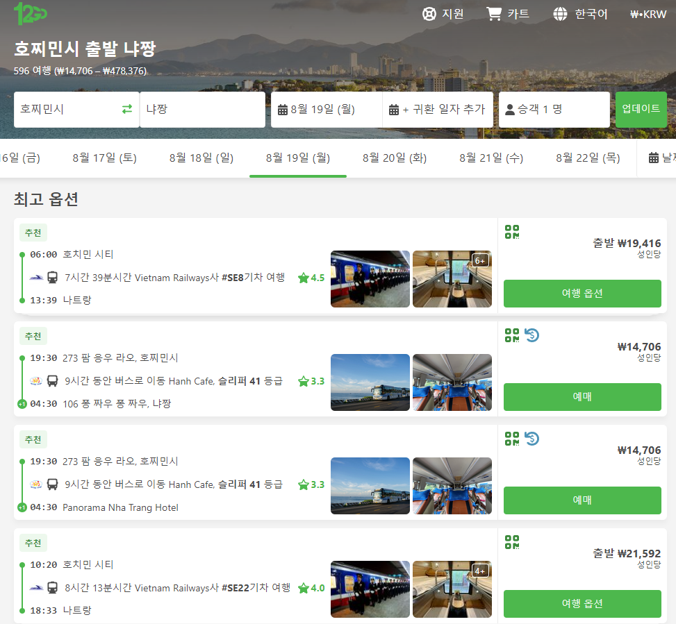 호치민에서 나트랑 가는 교통편 노선정보 및 예약은 12go사이트에서 예약하실 수 있으며, 이 노선 뿐만아니라 나라전역의 노선, 나라간 노선의 검색가능한 모든 교통편을 검색하고 예약하실 수 있습니다. 한국어로 검색해보시고 나오지 않으면 영어로 검색하시면 보다 쉽게 노선을 확인하실 수 있습니다.
