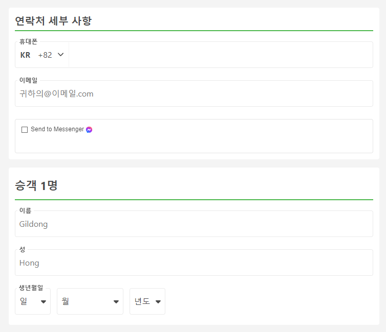 호치민에서 나트랑으로 이동하는 교통편 예약시에는 휴대폰번호, 이메일, 이름, 성, 생년월일을 입력하고 여행자 보험은 선택사항입니다.