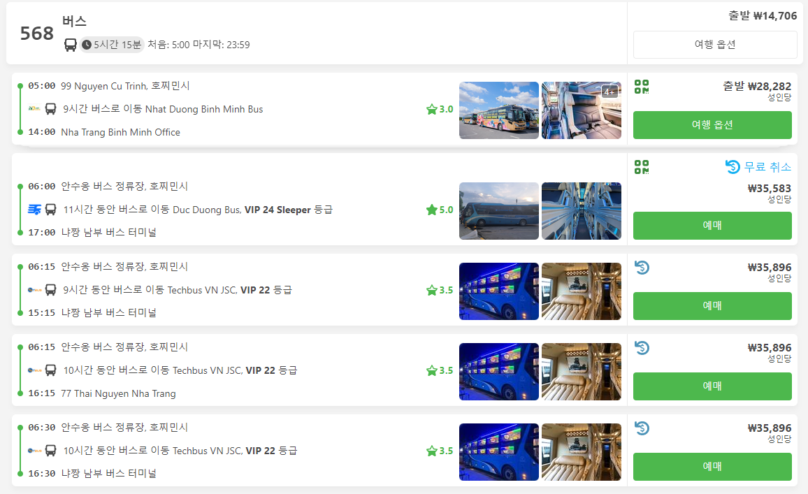 호치민에서 나트랑으로 가는 버스로 호치민 여행자거리 등에서 출발하며 가격은 1만원대 ~ 3만원대, 시간은 평균 9시간 이상 소요됩니다.