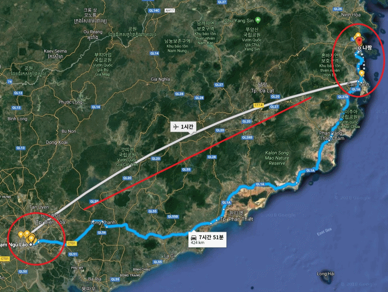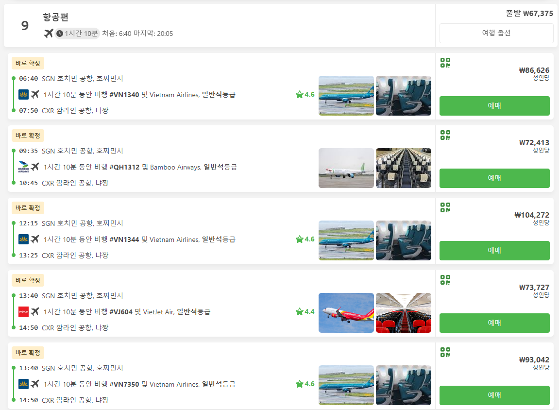 SGN Ho Chi Minh Airport 에서 출발하여 CXR Cam Ranh Airport로 가는 비행기로 가격은 항공사에 따라 6만원대부터 10만원대까지 있으며, 시간은 1시간 정도 소요됩니다.