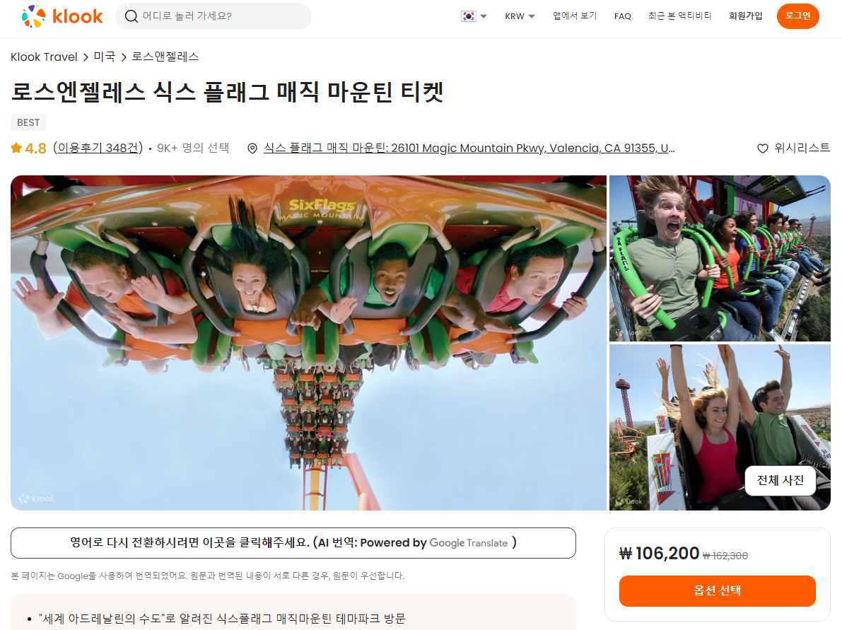 로스앤젤레스 식스 플래그 매직 마운틴 입장권 할인예약은 클룩사이트에서 쉽게 예약하실 수 있으며, 이메일, 전화번호, 카카오톡, 네이버, 구글, 애플, 페이스복 등으로 간편하게 회원가입하고 이용하실 수 있습니다. 가격은 변동될 수 있으므로 예약시 다시 확인하고 이용하세요~