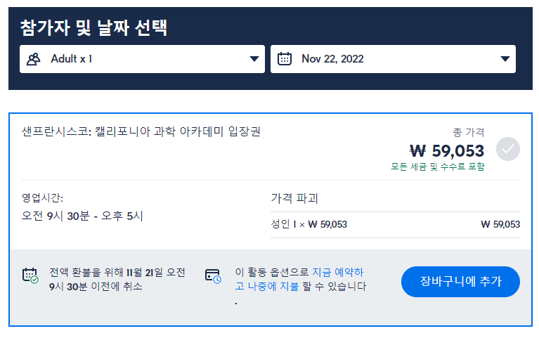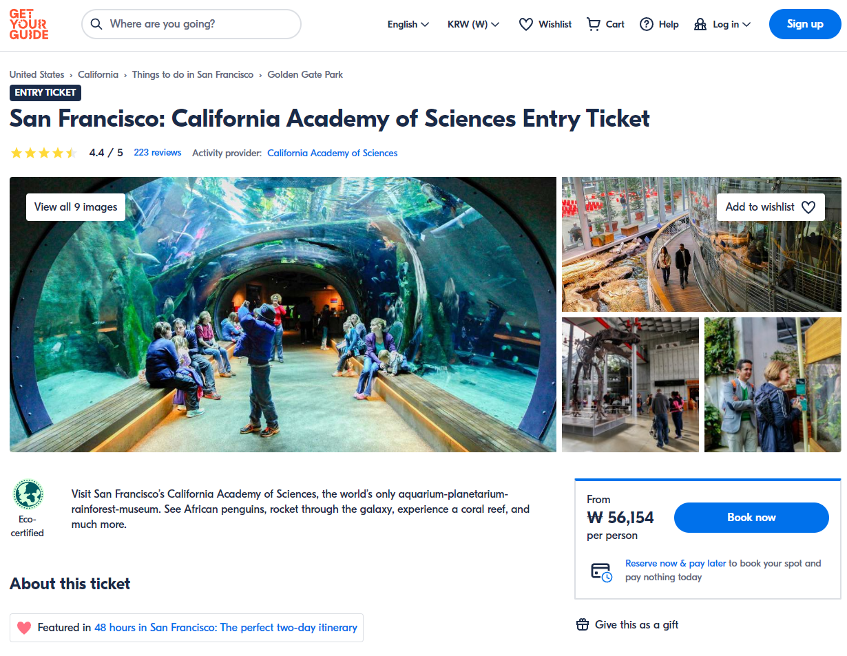 샌프란시스코 캘리포니아 과학 아카데미 입장권은 GET YOUR GUIDE 사이트에서 예약하실 수 있습니다. 사이트는 특히 전세계 대부분의 나라, 지역의 투어, 교통편 있어, 쉽게 찾을 수 없는 여행지의 다양한 투어 및 서비스를 이용할 수 있는 글로벌 사이트로 한국어사이트는 지원하지 않습니다. (글로벌 한국어 여행사이트를 찾으신다면 klook 여행사이트 추천합니다. 함께 사용하시면 더욱 편하게 여행하실 수 있습니다. klook에 찾는 정보가 없다면 GET YOUR GUIDE에서 찾으시면 됩니다.)