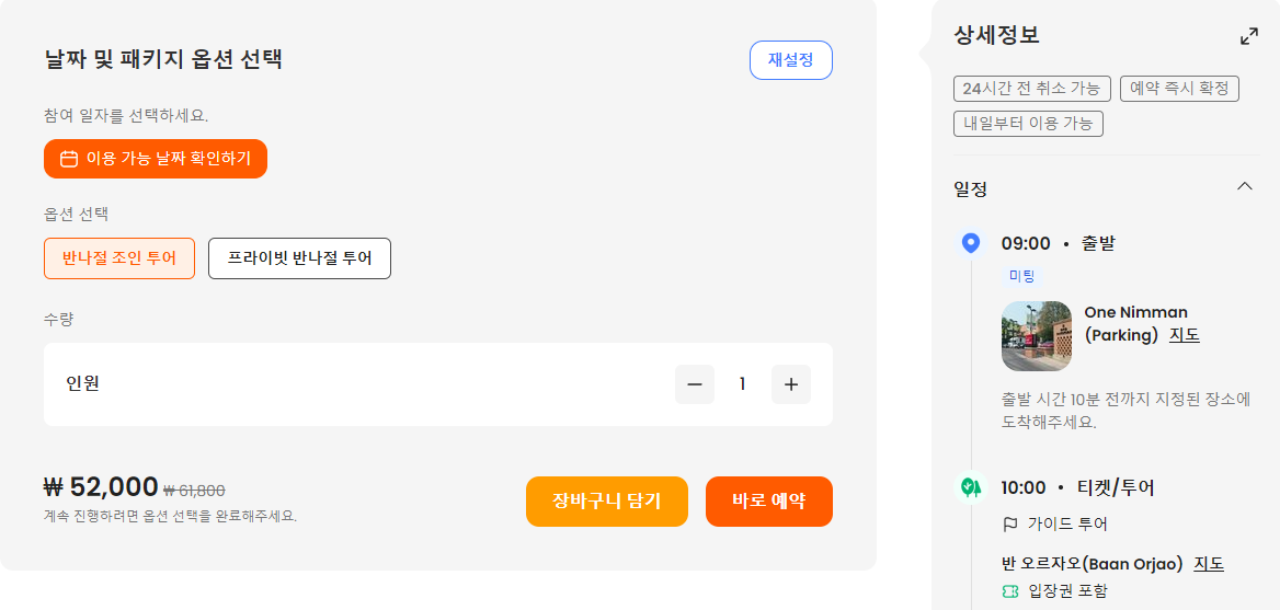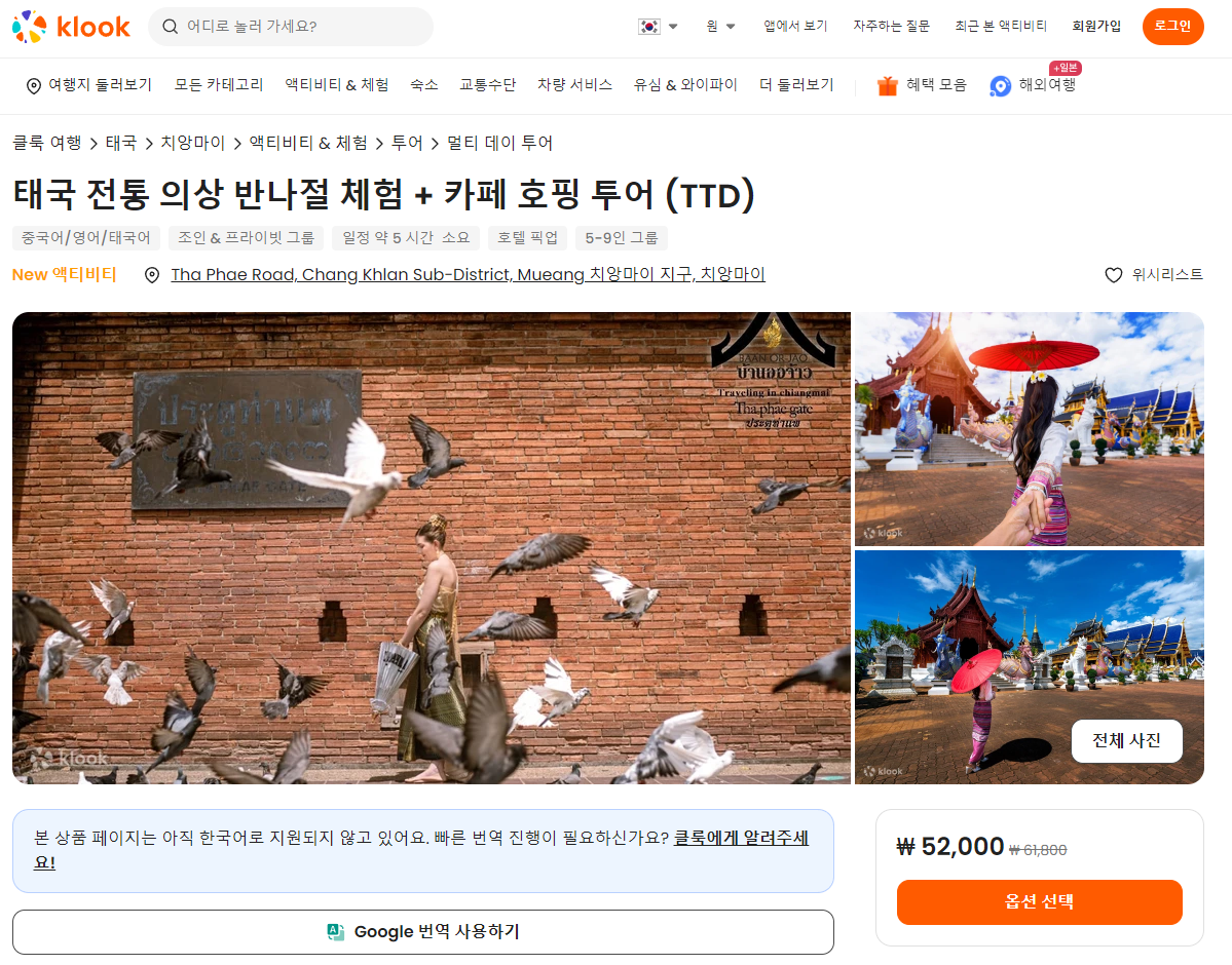 치앙마이의 태국 전통 의상 반나절 체험 및 카페 호핑 투어는 클룩사이트에서 쉽게 예약하실 수 있으며, 이메일, 전화번호, 카카오톡, 네이버, 구글, 애플, 페이스복 등으로 간편하게 회원가입하고 이용하실 수 있습니다. 가격은 변동될 수 있으므로 예약시 다시 확인하고 이용하세요~