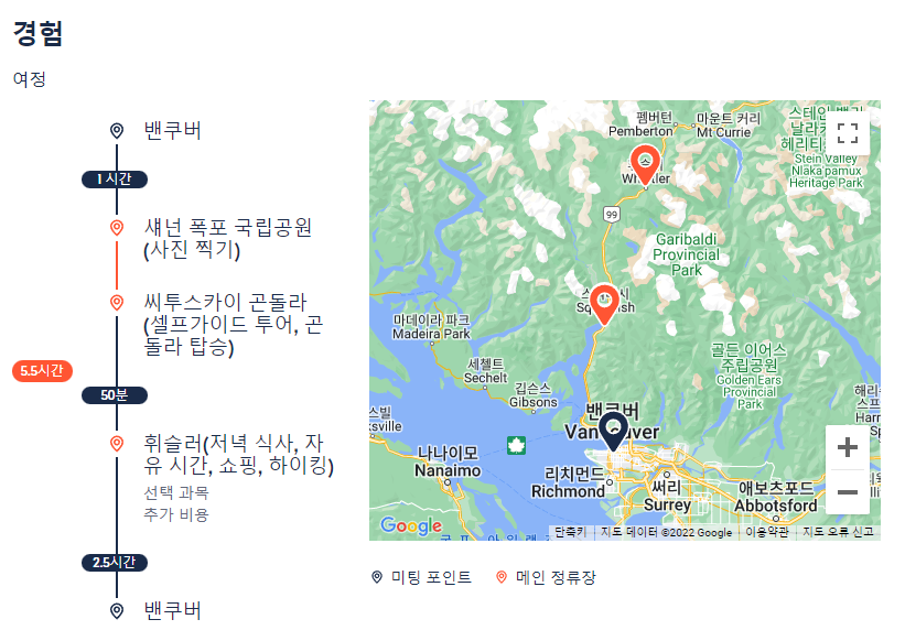 밴쿠버출발 스쿼미시(Squamish) Sea to Sky 곤돌라와 휘슬러 빌리지(Whistler Village) 일일투어는 GET YOUR GUIDE 사이트에서 예약하실 수 있습니다. 사이트는 특히 전세계 대부분의 나라, 지역의 투어, 교통편 있어, 쉽게 찾을 수 없는 여행지의 다양한 투어 및 서비스를 이용할 수 있는 글로벌 사이트로 한국어사이트는 지원하지 않습니다. (글로벌 한국어 여행사이트를 찾으신다면 klook 여행사이트 추천합니다. 함께 사용하시면 더욱 편하게 여행하실 수 있습니다. klook에 찾는 정보가 없다면 GET YOUR GUIDE에서 찾으시면 됩니다.)