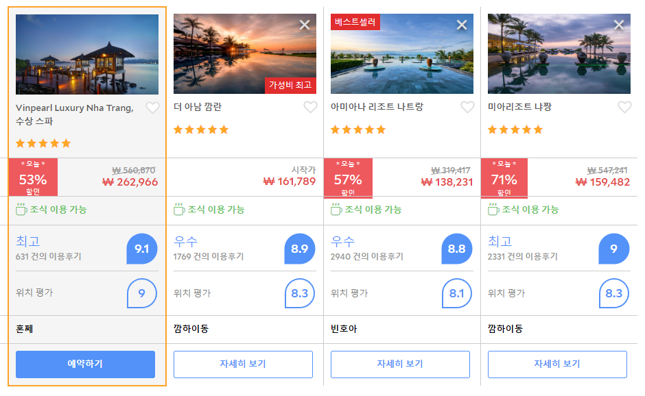 나트랑풀빌라 빈펄 럭셔리 나트랑 (Vinpearl Luxury Nha Trang)의 최저 가격대는 아고다웹사이트에서 할인특가 가격으로 매일매일 변동되며 20만원대부터 다양하게 형성됩니다. 날짜별로 매일 가격이 다르므로 아고다웹사이트 최저가를 확인하시려면 아래 링크를 누르시고 원하는 날짜의 가격대를 선택해야 정확한 가격을 자세히 보실 수 있습니다.