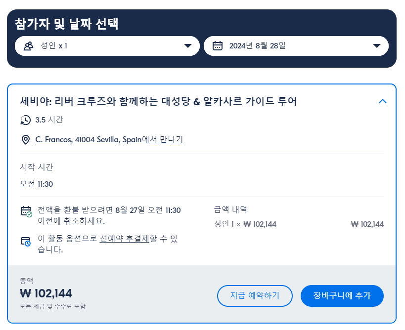 세비야 리버 크루즈와 함께하는 대성당 & 알카사르 가이드 투어는 GET YOUR GUIDE 사이트에서 예약하실 수 있습니다. 사이트는 특히 전세계 대부분의 나라, 지역의 투어, 교통편 있어, 쉽게 찾을 수 없는 여행지의 다양한 투어 및 서비스를 이용할 수 있는 글로벌 사이트로 한국어사이트는 지원하지 않습니다. (글로벌 한국어 여행사이트를 찾으신다면 klook 여행사이트 추천합니다. 함께 사용하시면 더욱 편하게 여행하실 수 있습니다. klook에 찾는 정보가 없다면 GET YOUR GUIDE에서 찾으시면 됩니다.)