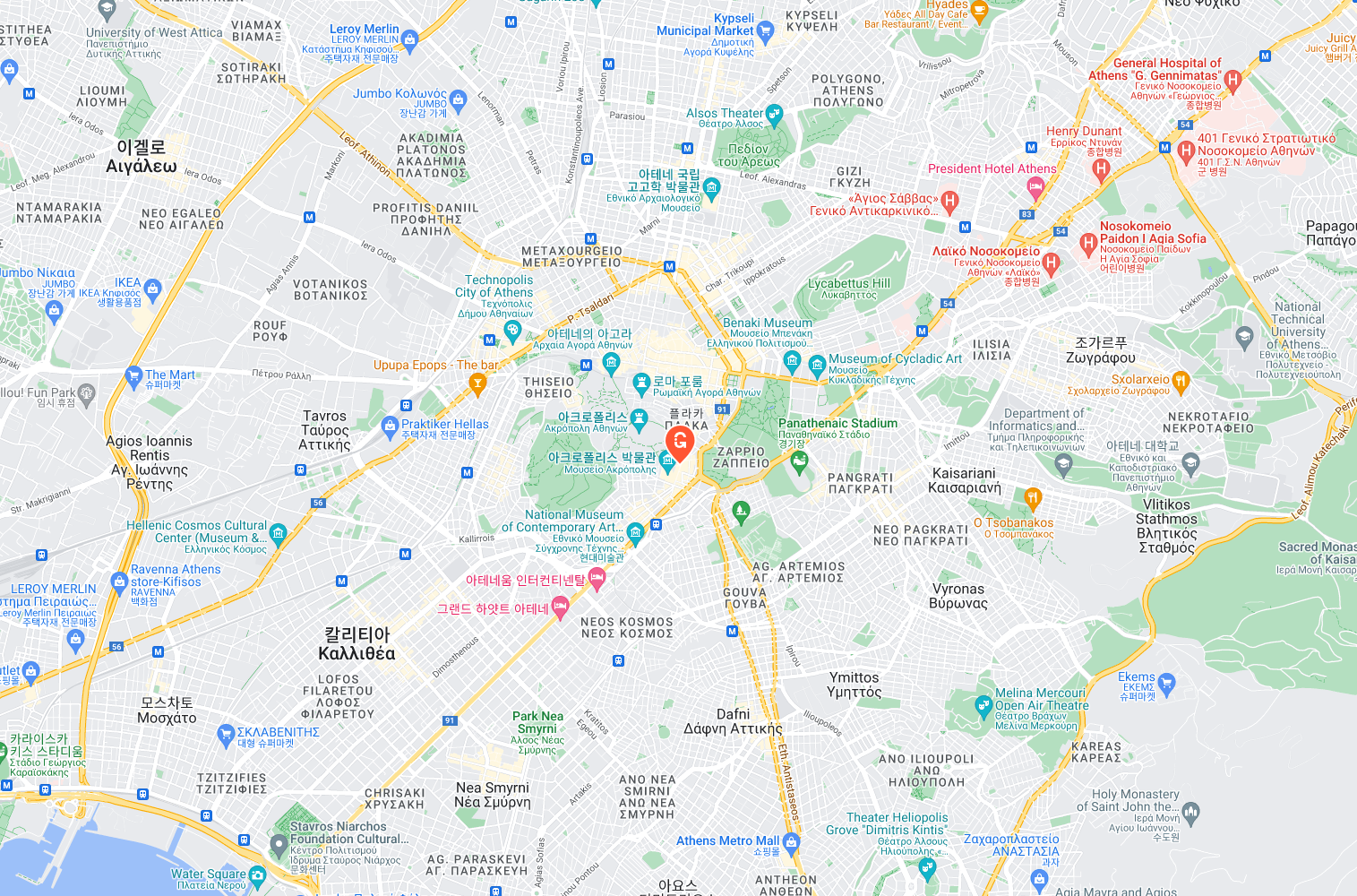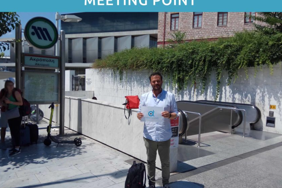 Crescendo Cafe 맞은 편 Acropolis 지하철역 밖에서 만나십시오. 지하철로 오시는 경우 Makriyianni/Dionysiou Arepaghitou 출구로 나오세요. 귀하의 가이드는 흰색과 밝은 파란색의 "Athenian Tours" 표지판을 들고 Makrigianni 보행자 통로의 Metro 표지판 옆에 서 있을 것입니다.