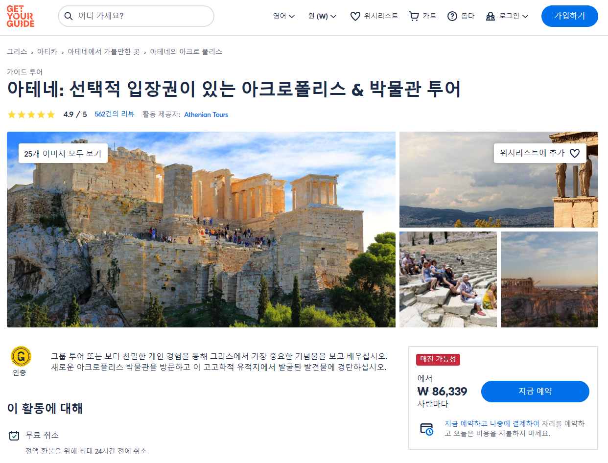 아테네 아크로폴리스 & 박물관 투어는 GET YOUR GUIDE 사이트에서 예약하실 수 있습니다. 사이트는 특히 전세계 대부분의 나라, 지역의 투어, 교통편 있어, 쉽게 찾을 수 없는 여행지의 다양한 투어 및 서비스를 이용할 수 있는 글로벌 사이트로 한국어사이트는 지원하지 않습니다. (글로벌 한국어 여행사이트를 찾으신다면 klook 여행사이트 추천합니다. 함께 사용하시면 더욱 편하게 여행하실 수 있습니다. klook에 찾는 정보가 없다면 GET YOUR GUIDE에서 찾으시면 됩니다.)