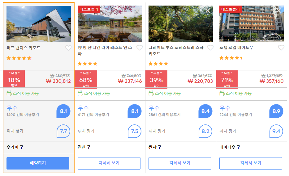 우라이온천호텔 퍼즈 랜디스 리조트 (Pause Landis Resort Wulai)의 최저 가격대는 아고다웹사이트에서 할인특가 가격으로 매일매일 변동되며 10만원대부터 다양하게 형성됩니다. 날짜별로 매일 가격이 다르므로 아고다웹사이트 최저가를 확인하시려면 아래 링크를 누르시고 원하는 날짜의 가격대를 선택해야 정확한 가격을 자세히 보실 수 있습니다.