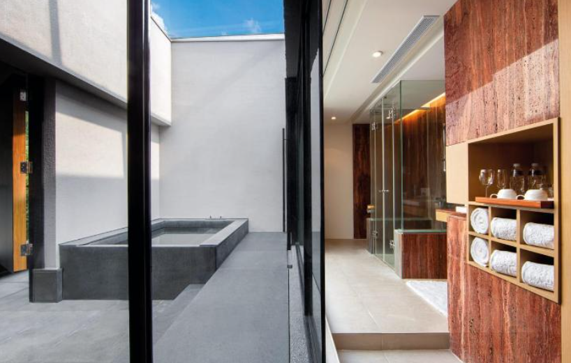 모든 객실에는 몸을 담글 수 있는 전용 수영장이 있습니다. 다 쓴 후에 그들이 커피 캡슐을 보충해주기를 바랍니다. 옆집 코고는 소리가 들린다....